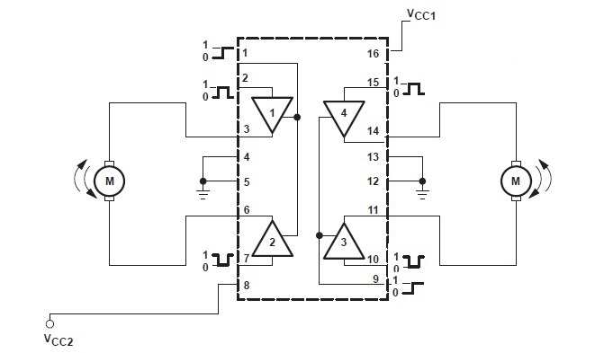 Utilizaremos el circuito integrado L293D que dispone de 4 medios puente H en un encapsulado DIL de 16 pines (l293(4Half_H_Bridges).pdf). La principal comodidad que brinda el integrado designado con la D final es la de tener incluidos ya en su interior los diodos de protección, de modo que podemos utilizar cargas inductivas (motores, relays, etc.) sin temor a picos inversos de tensión y sin necesidad de diodos externos.